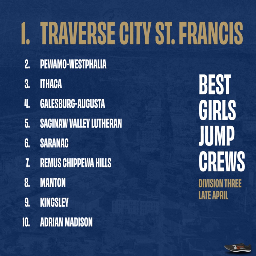 Grade Name Mark Team Points Event 11 Sophia Tucker 17′ 3″ Traverse City St. Francis 408 Long Jump 10 Helen Biggar 16′ 5.25″ Traverse City St. Francis 374 Long Jump 10 Mia Wildfong 14′ 6″ Traverse City St. Francis 293 Long Jump 10 Addie Lesinski 4′ 8″ Traverse City St. Francis 286 High Jump 11 Aubrey Lesinski 4′ 6″ Traverse City St. Francis 247 High Jump 9 Rachel Moore 4′ 6″ Traverse City St. Francis 247 High Jump
