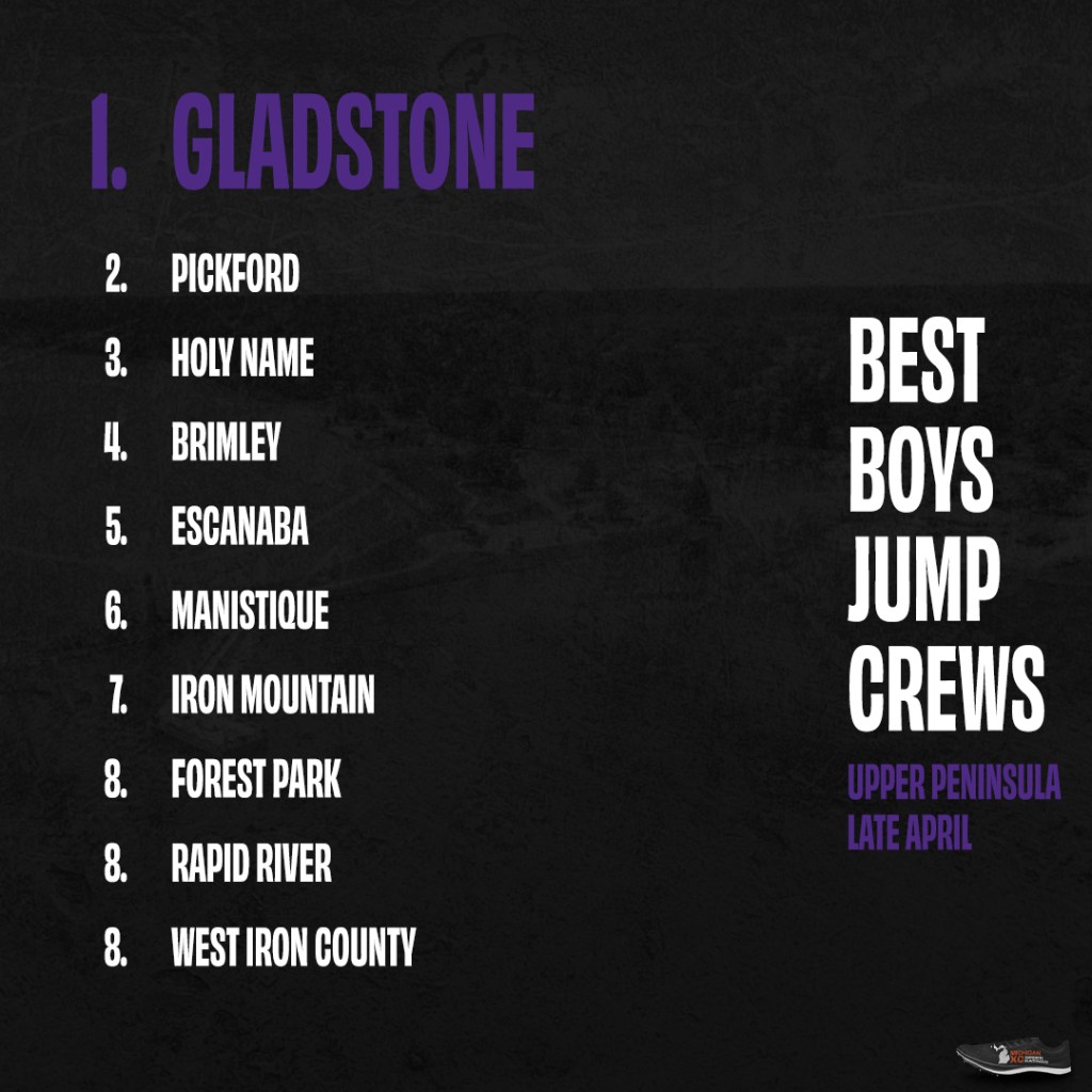 Rank Team High Jump Long Jump Total 1 Gladstone 687 296 983 2 Manistique 247 621 868 3 Iron Mountain 247 331 579 4 Escanaba – 551 551 5 Brimley 533 – 533 6 Pickford 286 – 286 6 St. Ignace 286 – 286 8 North Dickinson County 247 – 247 8 Rapid River 247 – 247