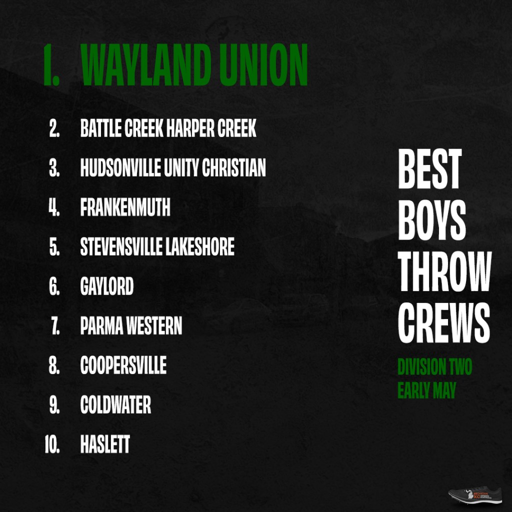 Rank Team Shot Put Discus Total 1 Wayland Union 1228 1265 2492 2 Battle Creek Harper Creek 1223 1232 2455 3 Hudsonville Unity Christian 1160 1206 2367 4 Frankenmuth 1178 1174 2352 5 Stevensville Lakeshore 1179 1071 2249 6 Gaylord 1294 905 2199 7 Parma Western 1288 869 2157 8 Coopersville 1234 879 2113 9 Coldwater 1276 780 2056 10 Haslett 831 1138 1968 11 Cadillac 1152 745 1897 12 Sparta 478 1282 1760 13 St. Joseph 853 906 1759 14 Berrien Springs 850 877 1727 15 Otsego 1219 440 1659 16 Three Rivers 853 779 1632 17 Owosso 797 810 1607 18 Whitehall 770 830 1600 19 Riverview 776 794 1569 20 Corunna 413 1150 1563 21 Niles 1171 378 1549 22 Tecumseh 779 762 1541 23 Detroit Voyageur 771 768 1539 24 Alma 756 772 1528 25 St. Clair 373 1140 1513