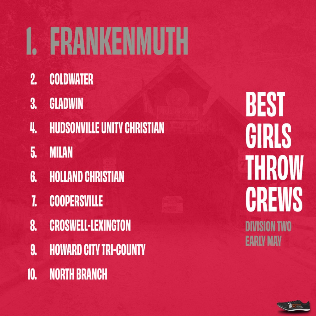 Rank Team Shot Put Discus Total 1 Morrice 1146 1108 2254 2 Climax-Scotts 1113 1133 2246 3 Marion 1082 1107 2189 4 Colon 1036 1086 2122 5 Potterville 1069 774 1843 6 Britton Deerfield 656 1102 1758 7 Breckenridge 851 809 1659 8 Saginaw Michigan Lutheran Seminary 1170 417 1588 9 Fowler 718 749 1467 10 Detroit Frederick Douglass 1074 344 1417 11 Allen Park Cabrini 691 715 1406 12 Camden-Frontier 670 694 1364 13 Frankfort 1013 333 1346 14 Southfield Christian 670 675 1345 15 St Philip Catholic Central 694 396 1090 16 Grand Traverse Academy 740 321 1060 17 East Jordan 357 696 1052 18 Morenci 339 707 1046 19 Kingston 705 334 1039 20 Bellevue 687 338 1025 21 Riverview Gabriel Richard – 1024 1024 22 Deckerville 677 336 1012 23 Manchester 413 415 828 24 Marlette 384 439 824 25 Hillsdale Academy 389 379 768