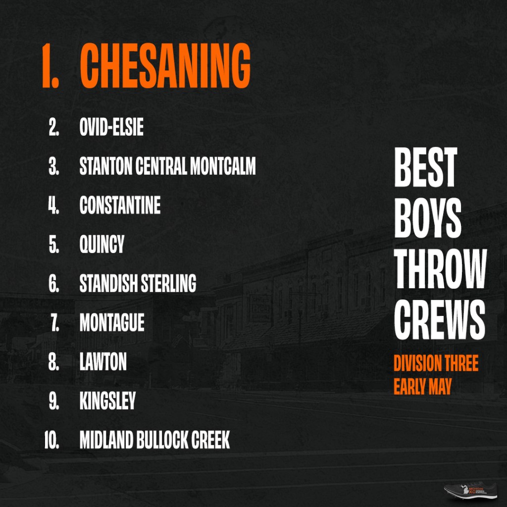 Rank Team Shot Put Discus Total 1 Chesaning 1250 1116 2366 2 Ovid-Elsie 1117 1199 2316 3 Stanton Central Montcalm 1150 1117 2267 4 Constantine 1147 1119 2267 5 Quincy 1076 1086 2162 6 Standish Sterling 819 1188 2007 7 Montague 1129 695 1824 8 Lawton 893 905 1798 9 Kingsley 421 1258 1678 10 Midland Bullock Creek 861 802 1663 11 Centreville 426 1148 1574 12 Mason County Central 425 1127 1552 13 Napoleon 782 743 1525 14 Ithaca 1136 347 1484 15 Manton 810 392 1202 16 Jonesville 387 783 1170 17 Bronson – 1129 1129 18 Laingsburg 371 758 1128 19 McBain 763 363 1126 20 Sanford-Meridian 364 759 1123 21 Pewamo-Westphalia – 1116 1116 22 Onsted 384 726 1110 23 Hartford 364 729 1093 24 Reese 385 707 1092 25 North Muskegon 745 342 1087