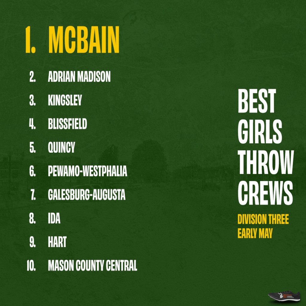 Rank Team Shot Put Discus Total 1 McBain 1143 1193 2336 2 Adrian Madison 1147 1110 2257 3 Kingsley 763 1150 1913 4 Blissfield 1124 723 1847 5 Quincy 725 1054 1779 6 Pewamo-Westphalia 798 877 1675 7 Galesburg-Augusta 776 720 1496 8 Ida 720 752 1472 9 Hart 698 767 1465 10 Mason County Central 703 735 1439 11 New Lothrop 1079 357 1436 12 Hemlock 1064 368 1432 13 Midland Bullock Creek 716 715 1431 14 Standish Sterling 719 707 1426 15 St. Louis 763 437 1201 16 Manton 749 397 1146 17 Brooklyn Columbia Central 755 378 1133 18 Ottawa Lake-Whiteford 347 772 1119 19 Kent City 723 390 1112 20 Montrose 584 526 1109 21 Buchanan 388 705 1093 22 Jonesville 361 717 1078 23 Schoolcraft 491 475 967 24 Springport 433 460 894 25 Manistee 399 450 848