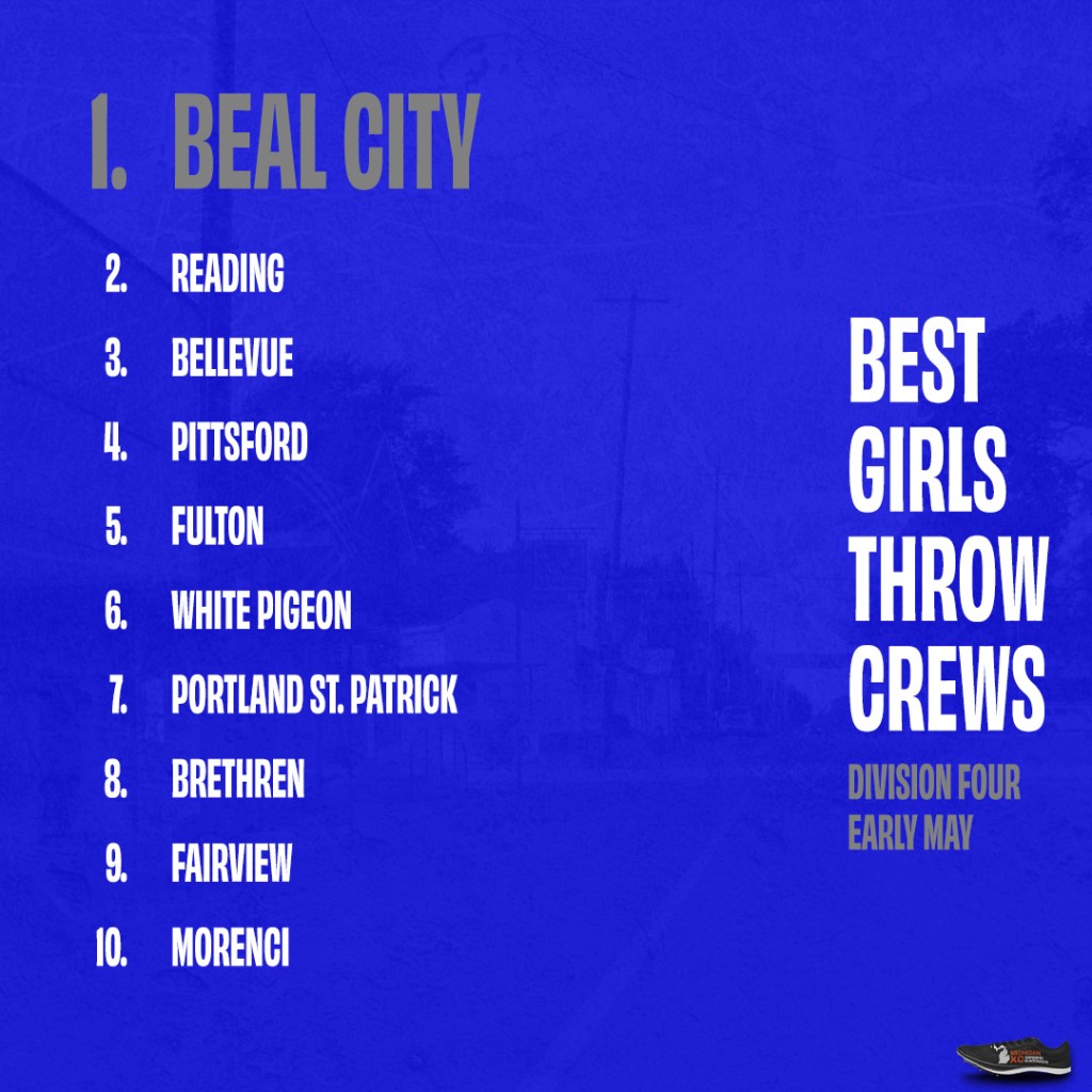 Rank Team Shot Put Discus Total 1 Beal City 1099 1152 2251 2 Reading 1040 735 1775 3 Bellevue 1055 706 1760 4 Pittsford 1017 674 1691 5 Fulton 702 794 1496 6 White Pigeon 770 702 1472 7 Portland St. Patrick 697 757 1454 8 Brethren 690 760 1450 9 Fairview 682 767 1449 10 Morenci 338 1081 1418 11 Petersburg-Summerfield 683 700 1383 12 Concord 998 348 1346 13 Potterville 761 378 1139 14 Montabella 763 333 1096 15 White Cloud 320 762 1082 16 Addison 693 371 1064 17 Decatur 698 353 1051 18 Athens 706 336 1042 19 Lake Leelanau St. Mary 329 700 1029 20 Unionville-Sebewaing 381 442 823 21 Carson City-Crystal 393 402 795 22 Bridgman 404 342 747 23 Southfield Christian 402 340 742 24 Lawrence 349 393 742 25 Morrice 393 329 722