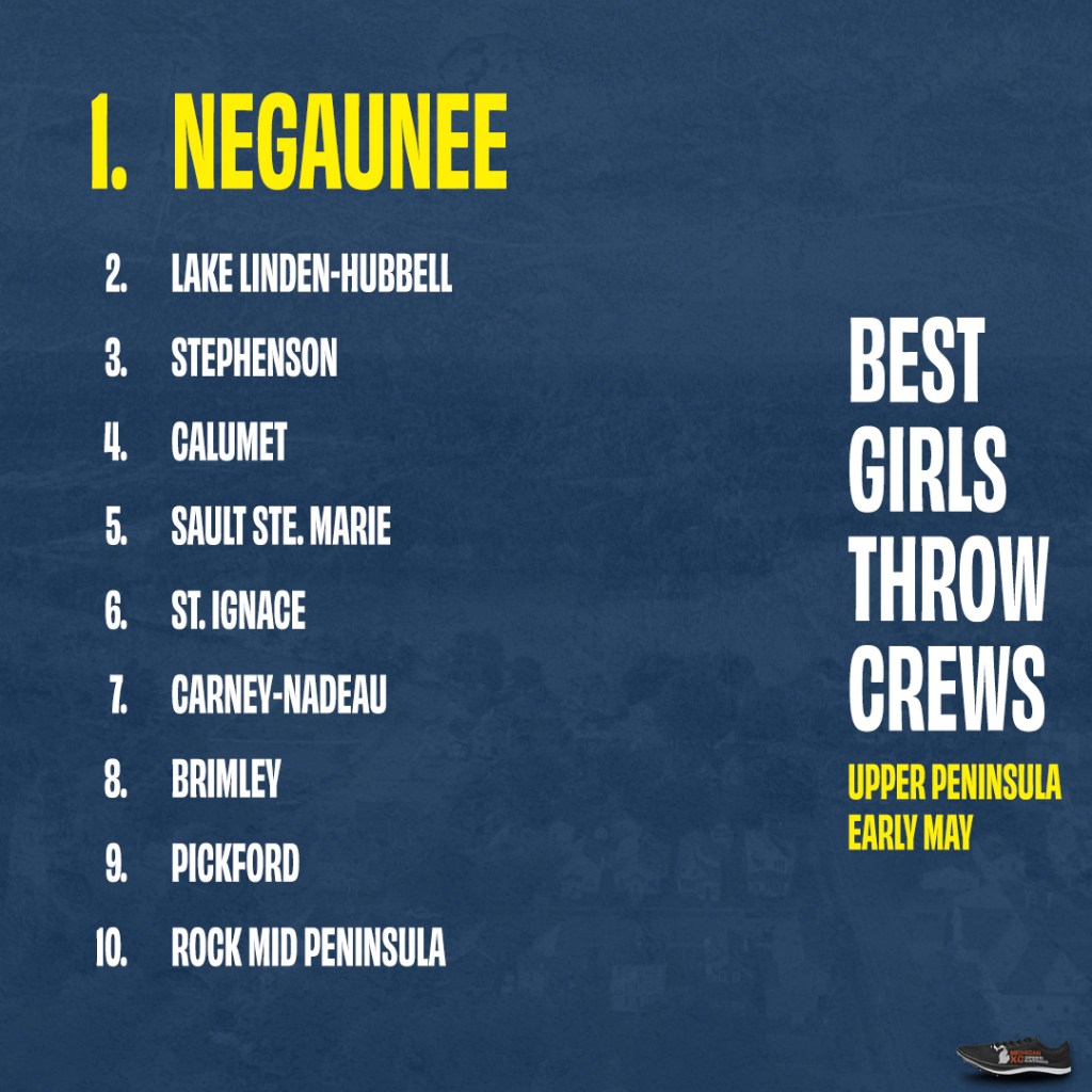 Rank Team Shot Put Discus Total 1 Negaunee 997 1094 2091 2 Lake Linden-Hubbell 1040 680 1720 3 Stephenson 732 731 1463 4 Calumet 716 690 1406 5 Sault Ste. Marie 748 379 1127 6 St. Ignace 336 672 1008 7 Carney-Nadeau 381 391 773 8 Brimley 360 388 748 9 Pickford 362 382 744 10 Rock Mid-Peninsula 354 368 722 11 Engadine 329 353 682 12 Houghton 673 – 673 13 Munising 329 336 665 14 Newberry 665 – 665 15 Ishpeming 416 – 416 16 Manistique 389 – 389 17 Ironwood 380 – 380 18 Kingsford – 357 357 19 Rudyard 349 – 349 20 Powers North Central 346 – 346 21 Big Bay De Noc 343 – 343 22 North Dickinson County 339 – 339 23 Gladstone 331 – 331 24 Bessemer 323 – 323 25 Marquette 322 – 322