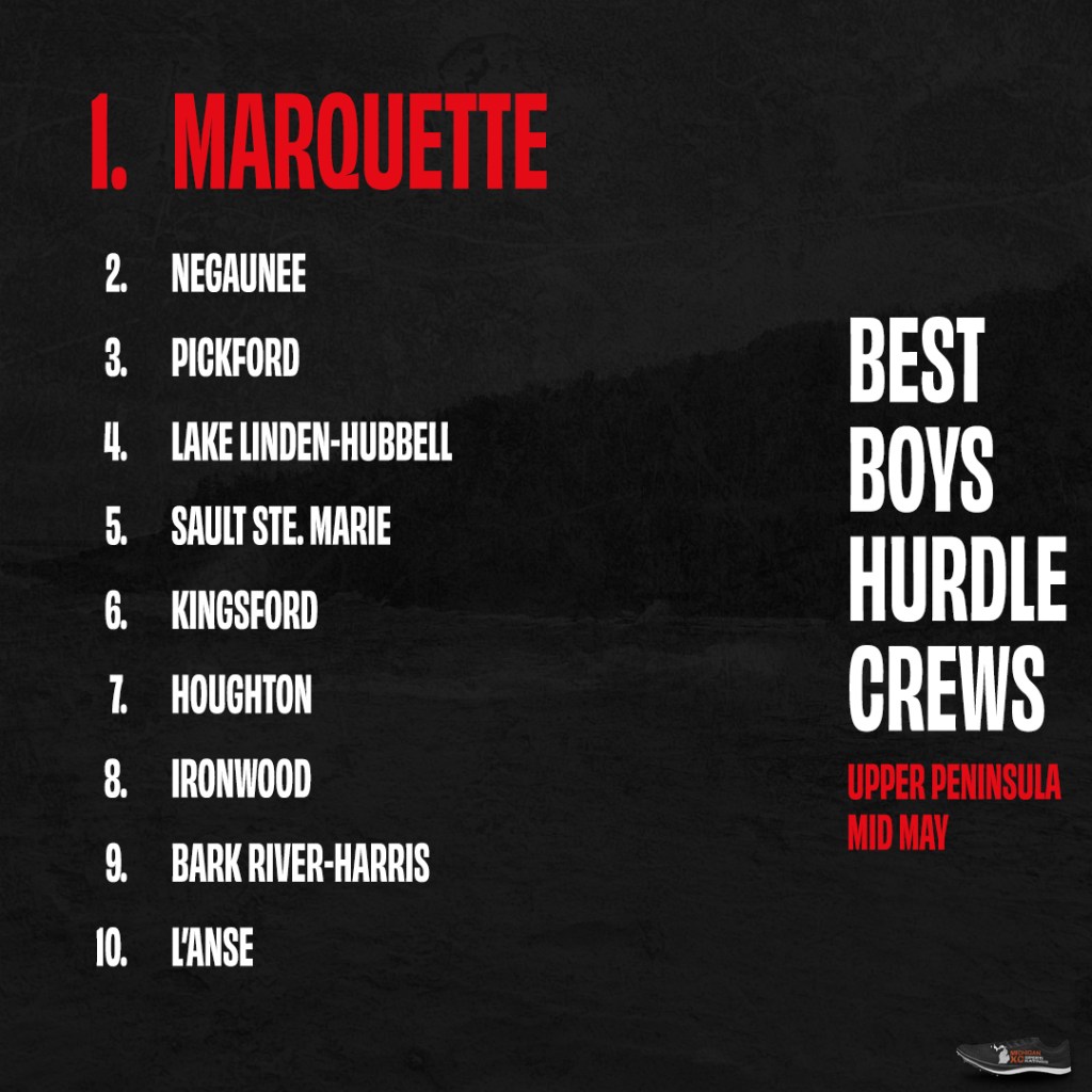 Rank Team 110h 300h Total 1 Marquette 858 1017 1875 2 Negaunee 858 1000 1858 3 Pickford 619 714 1333 4 Lake Linden-Hubbell 487 836 1323 5 Sault Ste. Marie 631 632 1264 6 Kingsford 528 374 902 7 Houghton 367 311 678 8 Ironwood 343 312 655 9 Bark River-Harris 314 317 631 10 L’Anse 288 318 606 11 Brimley 231 220 451 12 Ishpeming Westwood 159 288 448 13 Forest Park 193 233 426 14 Rapid River 203 216 419 15 Ontonagon Area 159 210 369 16 Norway 140 213 353 17 Chassell – 255 255 18 Manistique – 221 221 19 Escanaba 199 – 199 20 St. Ignace 158 – 158 21 North Dickinson County 142 – 142 22 Stephenson 137 – 137