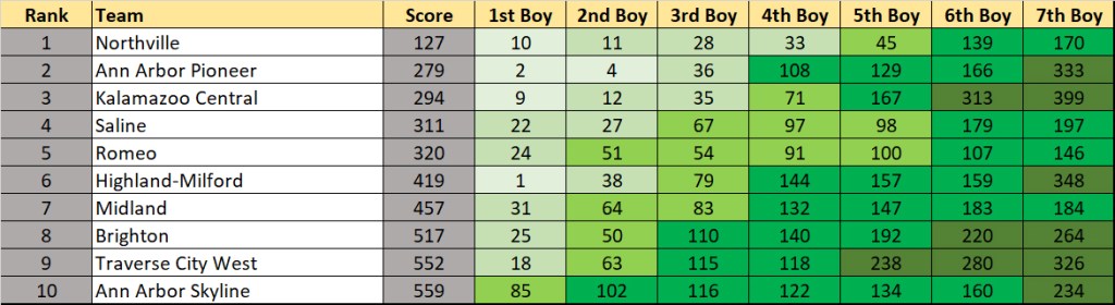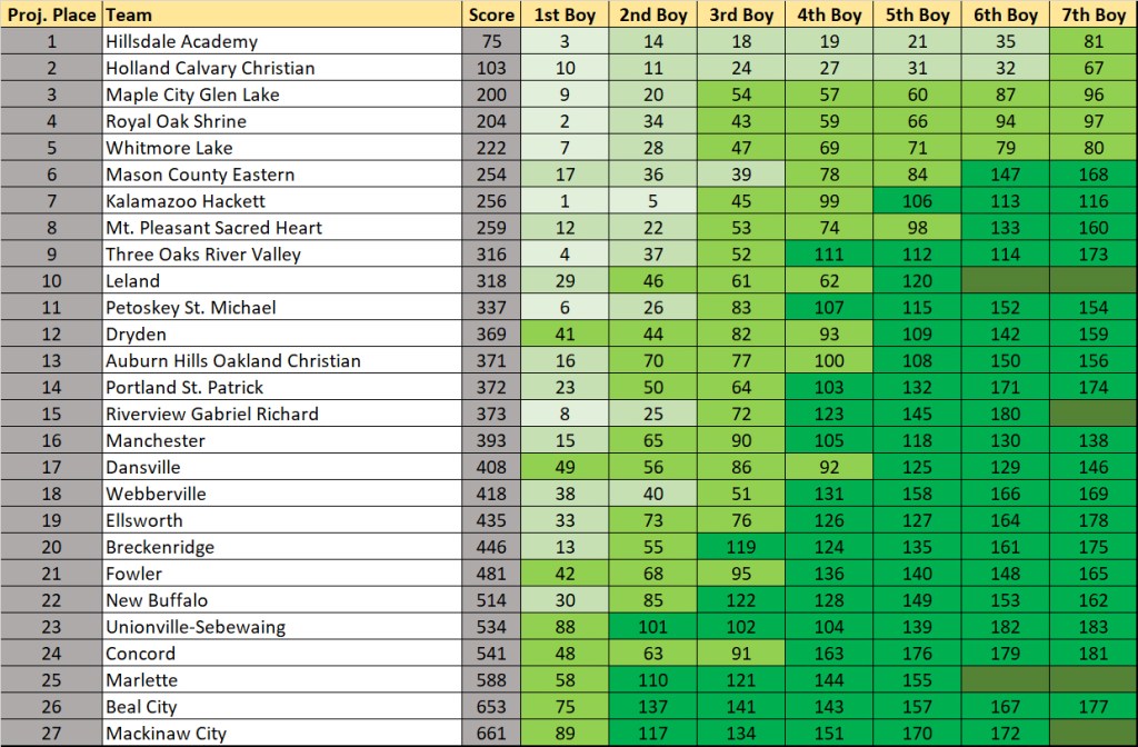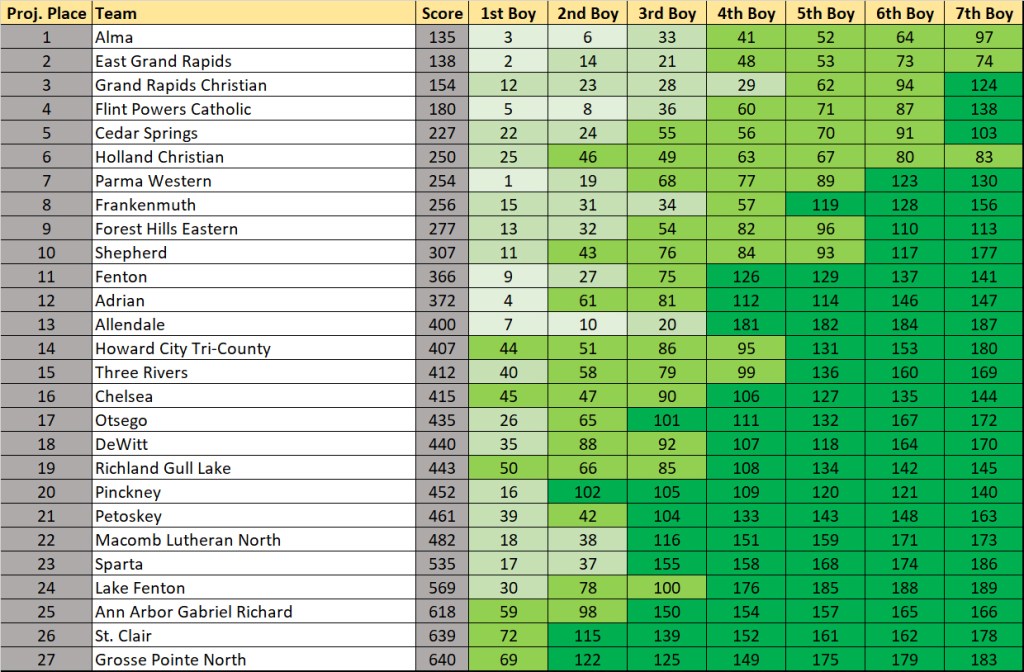 I’m throwing all these into one post, with a little bit written about each team. Contained at the end are the State Finals Projections, which are in the same vein as the Top Tens, but a little different. These combine the top-3 teams from all the regional projections in order to form an idea of what *might* occur at MIS in early November.