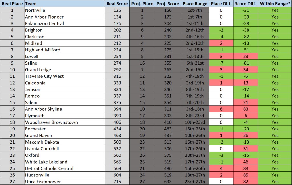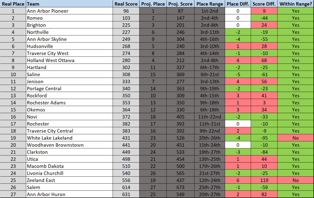Virtually all the D1 teams hit on their expected finishing range, with only one stepping to the better side – the White Lake Lakeland Girls. A very typical pattern for the school, as they’re a bit more judicious in the amount of their races, saving their legs for their fastest efforts to close the season.