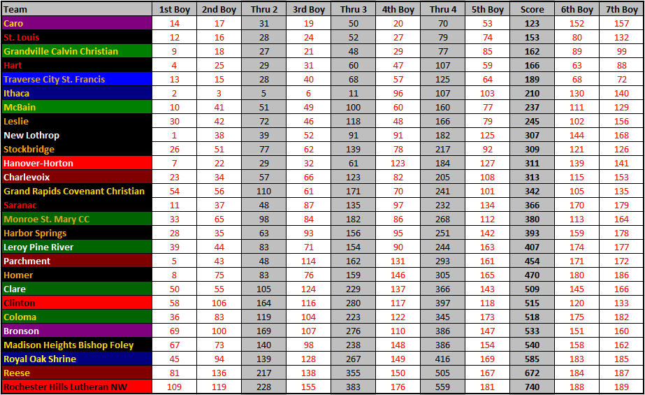 Kalamazoo Christian can really pack up. In their victory in Region 32-4, the gap between their 1st and 5th runners was under 0:45. In the 20-21:00 range too, at Portage, which is a fair course.