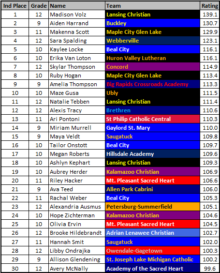 Beal City is the mystery here. Dave King’s magic looms large in Division 4 lore. If you took just the ratings from their regional meet, they’d place between 100-110 points. A negative aspect of these ratings is they probably underrate teams that peak extra hard at the end of the year. There is a reason for that, as one race brings in a ton of variability and I’d rather grab a season worth of data. Expect less than 170 points from the Aggies.
