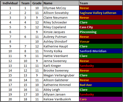 I’m not sure how she does it, but Libby always brings her best effort to the Scottie Classic. Two years there, two sub-19 efforts. She’s brought it in many other meets as well, finishing 3rd both years at Regionals (once at Shepherd, once at Uncle John’s), and top-10 in the State as well.