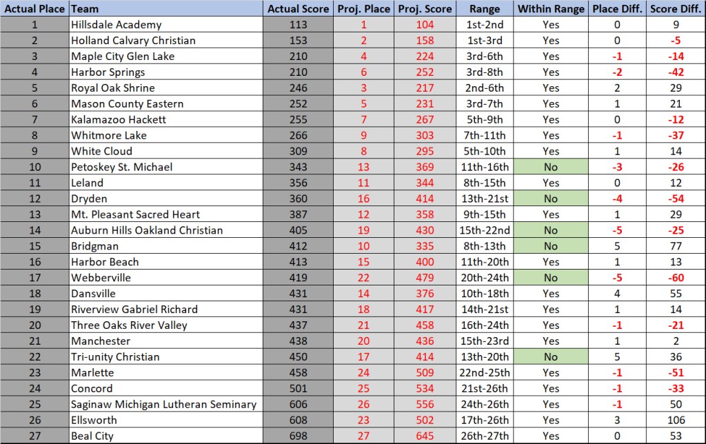 As expected, Whitmore Lake scored between 100-150 points and won another state title. Unexpected, however, was the gap. Projections had the Trojans at 135 points, clear of 2nd place by nearly 35 points. But not so! If the Trojans had hit their 135 projected points, 2nd place would be in the cards. Kaylie Livingston, Elodie Weaver, and Carina Burchi all did their All-State or State Champion work, which are great in an individual sense, but not as impactful in the team scoring. The 4th and 5th spots were huge, Sofia Robertson drawing from years of championship experience and Malynda Lambros finding a 40+ second PR. Lambros was projected well above 100th place and finished 63rd. I guess when you train with these high performers all season, you gain the confidence that you too can perform on the big stage.