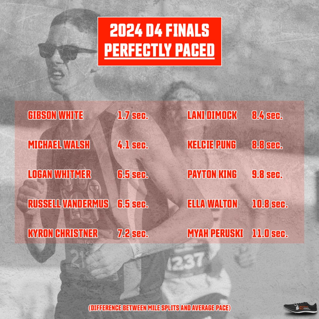 Caroline Roberts (18%) – the Roberts girls have had a history of State Finals triumphs. They also possess a little speed, Caroline flashing hers in the final tenth of a mile, passing two girls to move from 31st to 29th. The fastest kick of the day in D4!