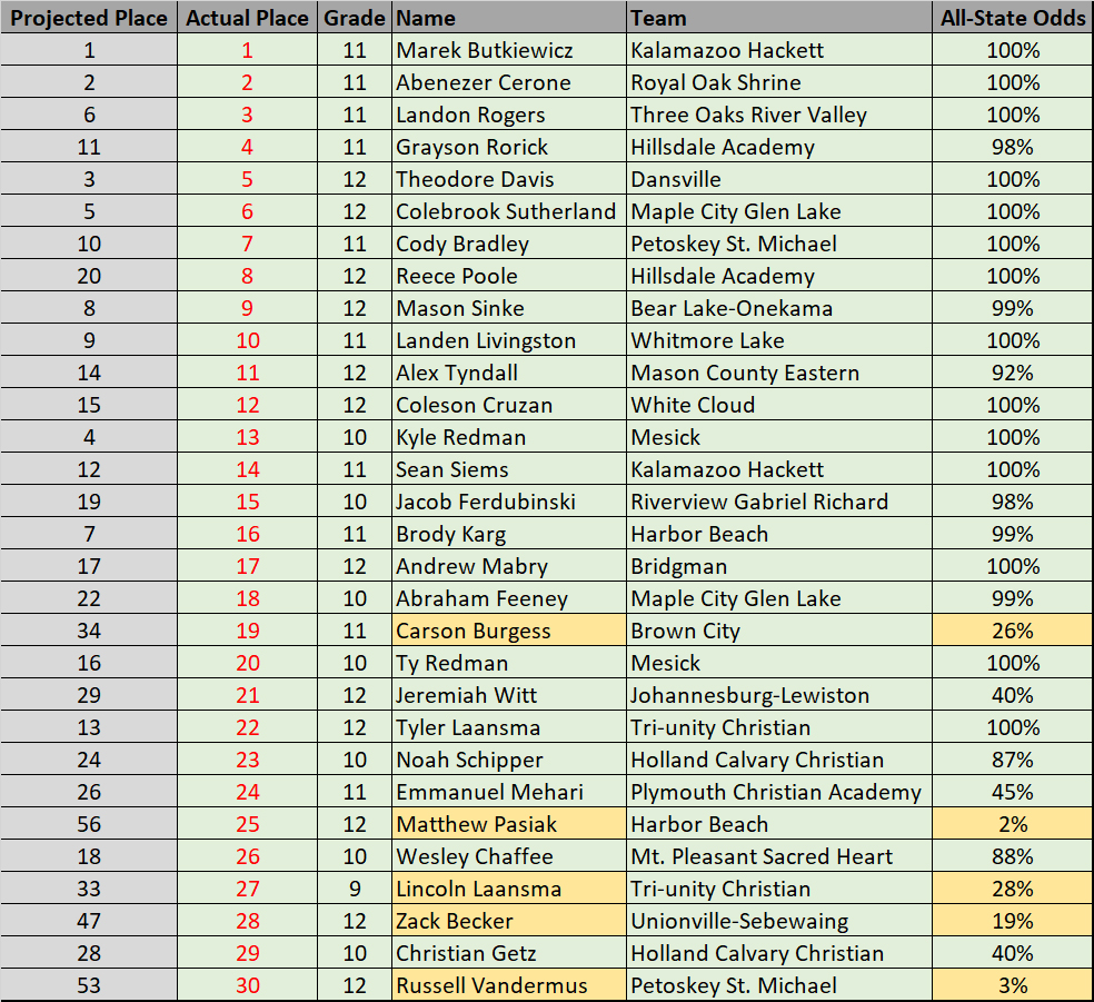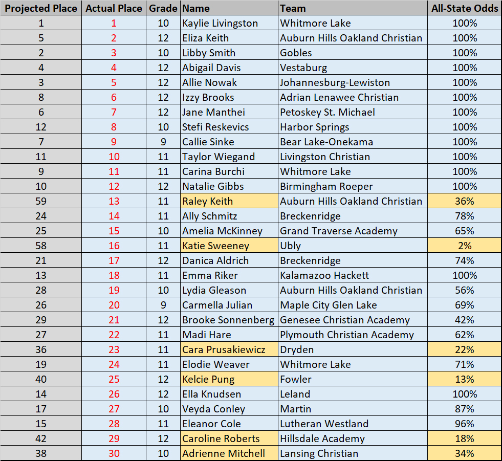 The pre-race projections nailed all but six of the All-Staters. Those six took various routes to get on the stage, each worthy of their momentous accomplishment. Hitting it against the odds were: